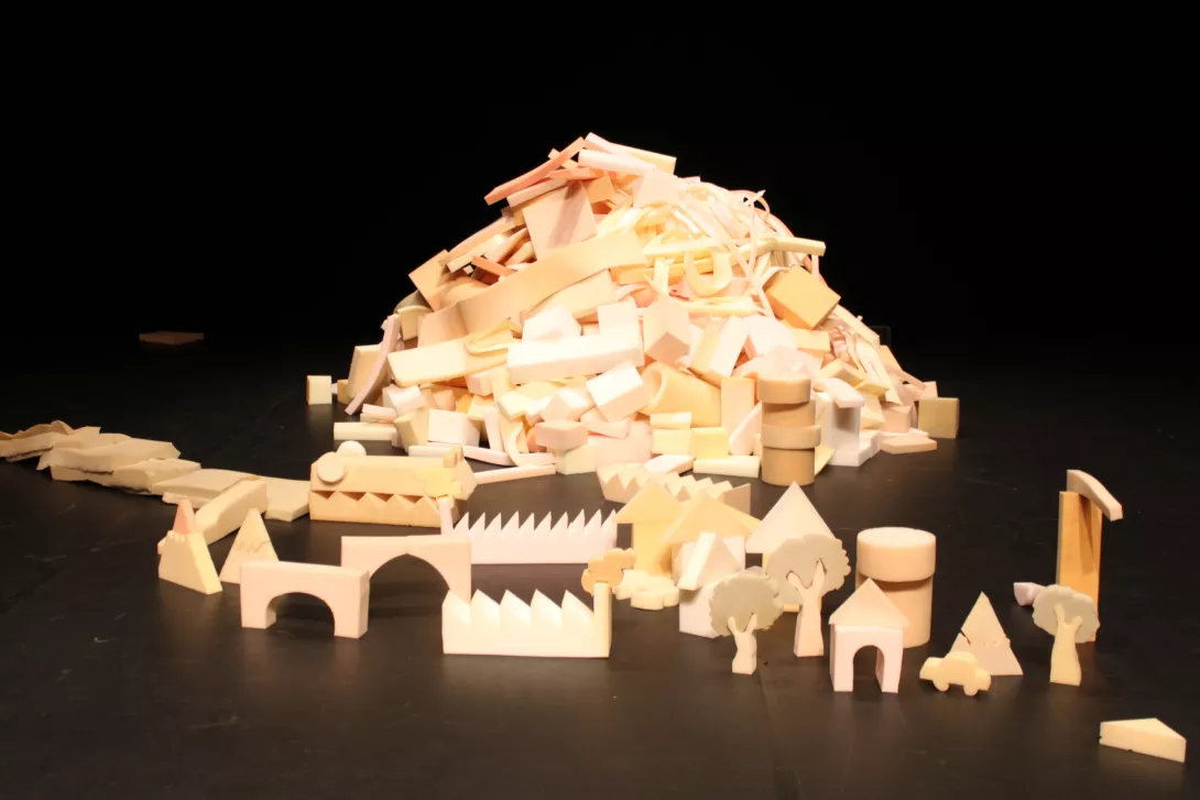 Un tas de mousse s’anime peu à peu et devient tour à tour animal, paysage, cabane, sous l’action d’une danseuse. Cette matière douce, moelleuse et surprenante devient ensuite terrain de jeux des enfants qui laissent libre cours à leur imagination au gré des formes rencontrées. On s’émerveille de ce qui change, se construit, se déconstruit. Une ode à l’invention, la liberté du jeu, l’écoute mutuelle et la puissance de l’imaginaire partagé.