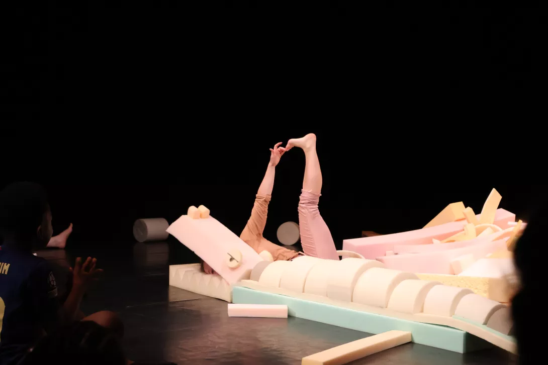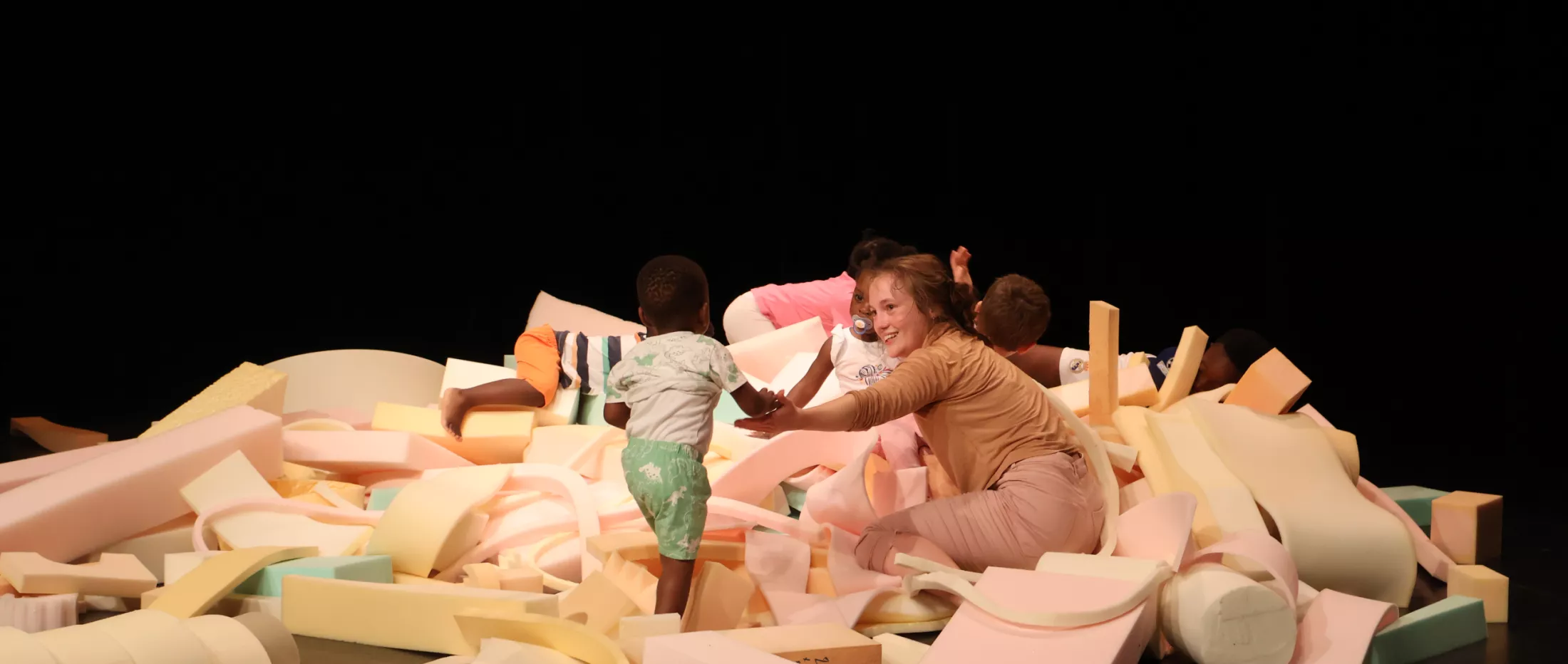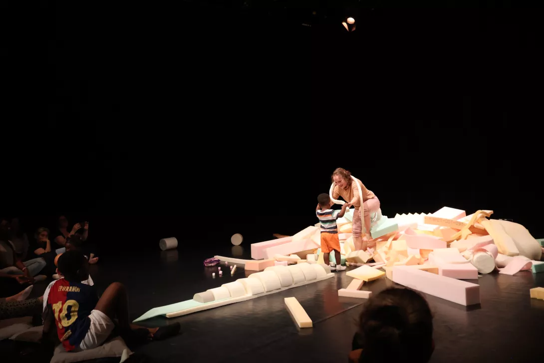 Un tas de mousse s’anime peu à peu et devient tour à tour animal, paysage, cabane, sous l’action d’une danseuse. Cette matière douce, moelleuse et surprenante devient ensuite terrain de jeux des enfants qui laissent libre cours à leur imagination au gré des formes rencontrées. On s’émerveille de ce qui change, se construit, se déconstruit. Une ode à l’invention, la liberté du jeu, l’écoute mutuelle et la puissance de l’imaginaire partagé.