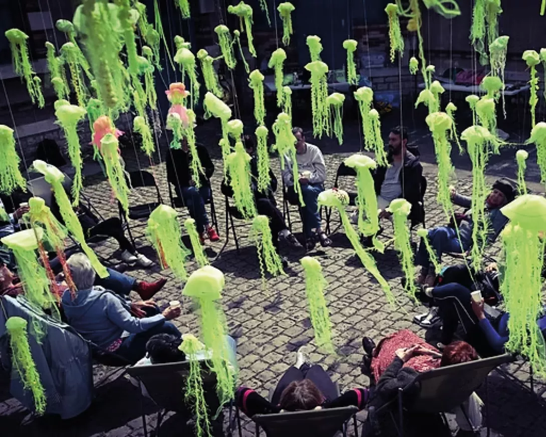 Rejoignez l’aventure avec des ateliers ouverts : créez votre propre méduse textile, ajoutez votre geste aux tracés de l’installation, faites évoluer cette œuvre vivante et collective ! Imaginons ensemble d’autres futurs de façon sensible, créative et joyeuse. Votre présence, vos mains et votre créativité sont les bienvenues : venez amplifier Scélérates avec nous !